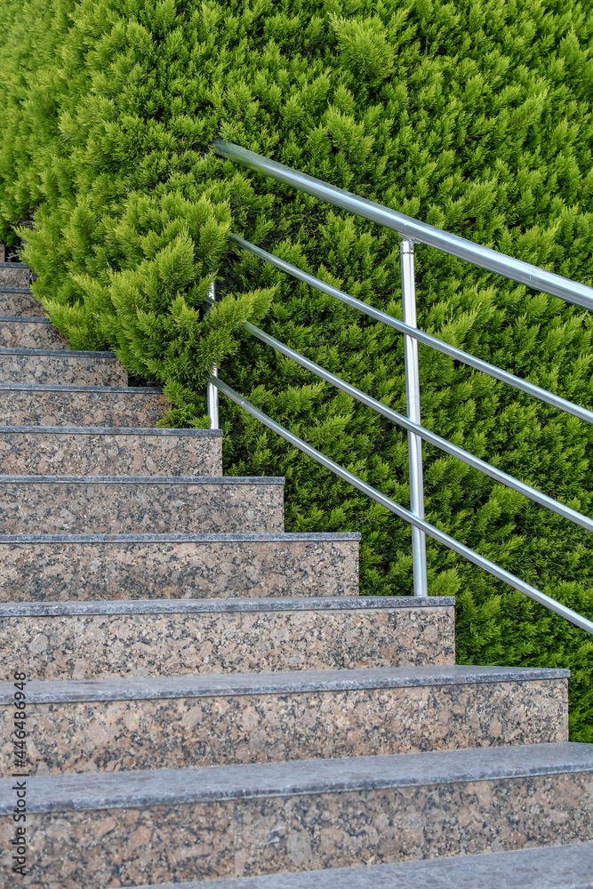 Close up of outdoor stairs with steel railings, covered by green thuja plants.