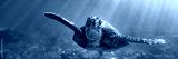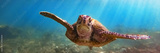 Green sea turtle above coral reef underwater, blue ocean in sunny tropical day