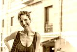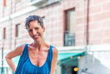 Portrait of a cheerful short hair mature woman on the street looking at camera