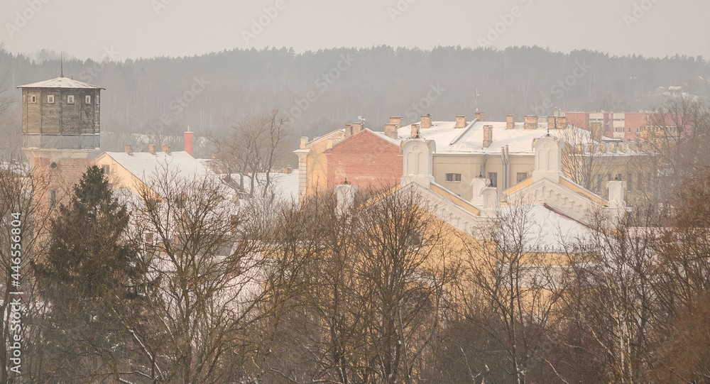 Aerial view of Kuldiga old town in winter day, Latvia.