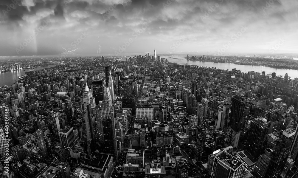 New York City skyline with Manhattan skyscrapers at dramatic stormy sunset, USA.