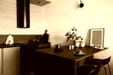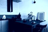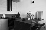Stylish composition of modern small kitchen interior. Black furniture, workspace and dining space with black and light wooden kitchen accessories. Minimalistic masculine concept. Template.