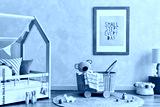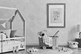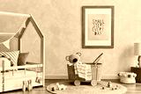 Stylish composition of cozy scandi child's room interior with mock up poster frame, bed, rattan basket, plush and wooden toys and decorations. Creative wall, carpet on the floor. Copy space.