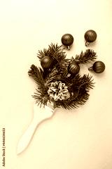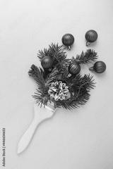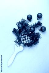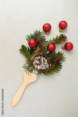 Top view of paintbrush with Christmas composition on the gray background. Location vertical.