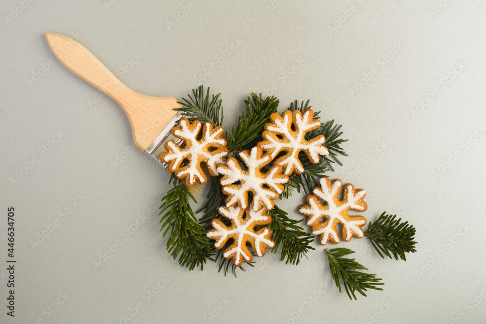 Top view of paintbrush with Christmas composition on the gray background. Close-up.