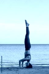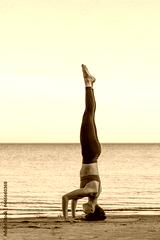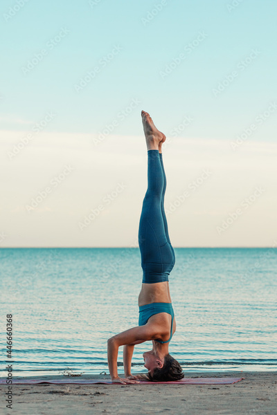 a young attractive woman practicing yoga performs the exercise Shirshasana, a headstand. a woman of Asian appearance on the beach