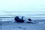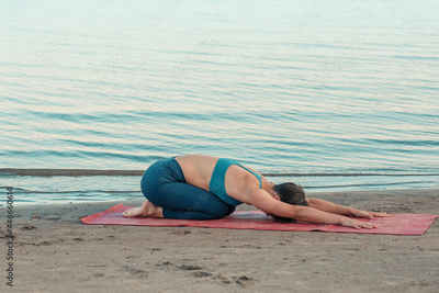 a young attractive Asian woman practicing yoga performs a stretching exercise on the beach