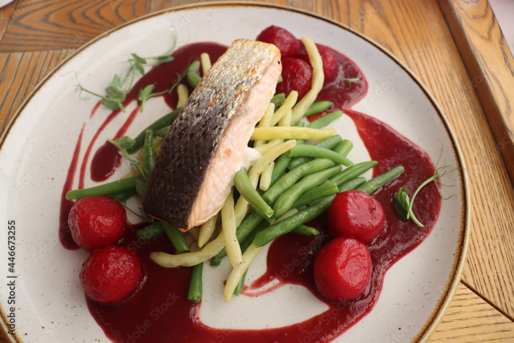 salmon on a vegetable pillow with raspberry sauce and bread balls
