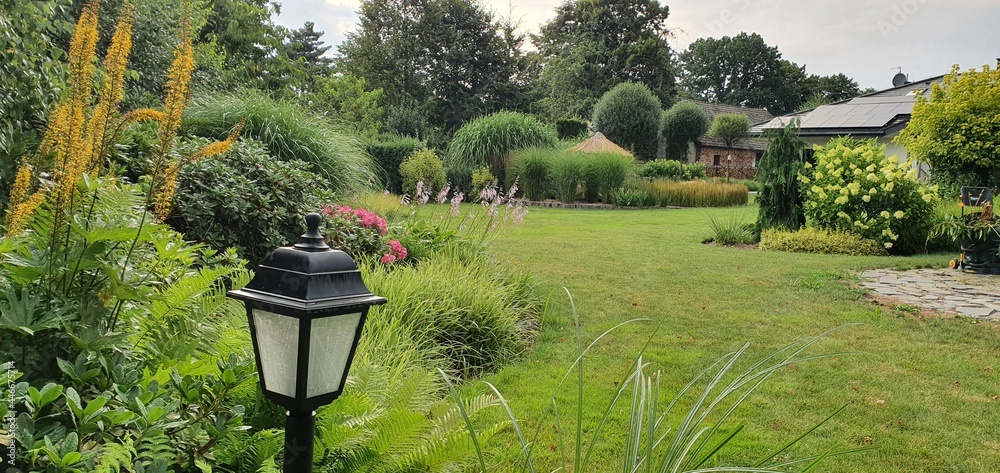 Wspaniały zadbany ogród z piękną zielenią traw i roślin ozdobnych