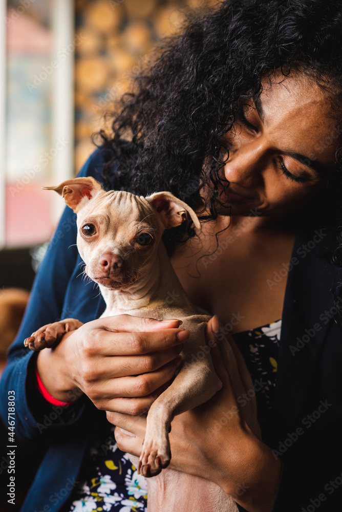 Mujer con chihuahua en sus brazos mientras ve frente a la cámara