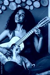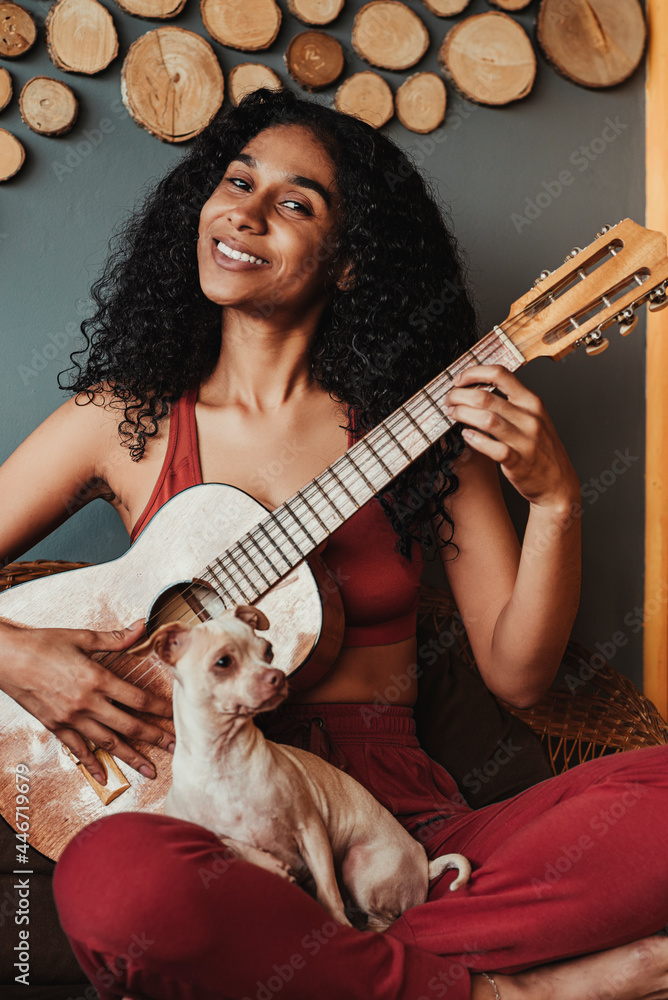 Vertical de mujer negra con una guitarra y un perro chihuahua en sus piernas