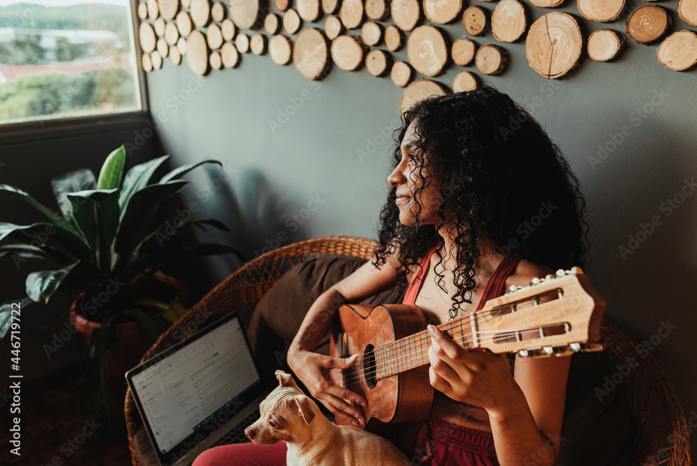 Mujer morena con un guitarra recibiendo lecciones por una computadora en línea con un perro en sus piernas