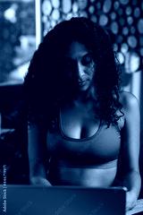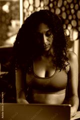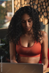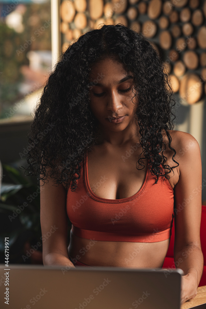 Vertical de mujer negra de cabello rizado haciendo tele trabajo desde un hostel