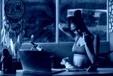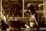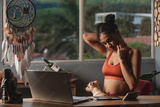 Mujer negra haciendo ejercicios de relajación con su perro en los regazos mientras hace tele trabajo