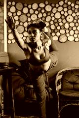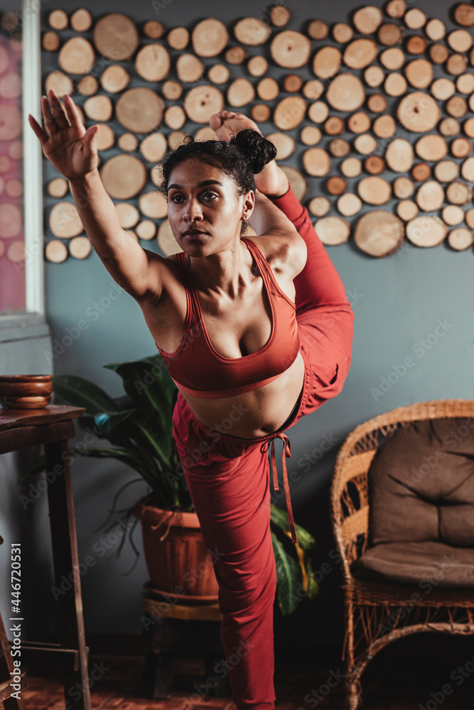 Vertical of a brunette woman doing yoga in a hostel with a peaceful atmosphere.