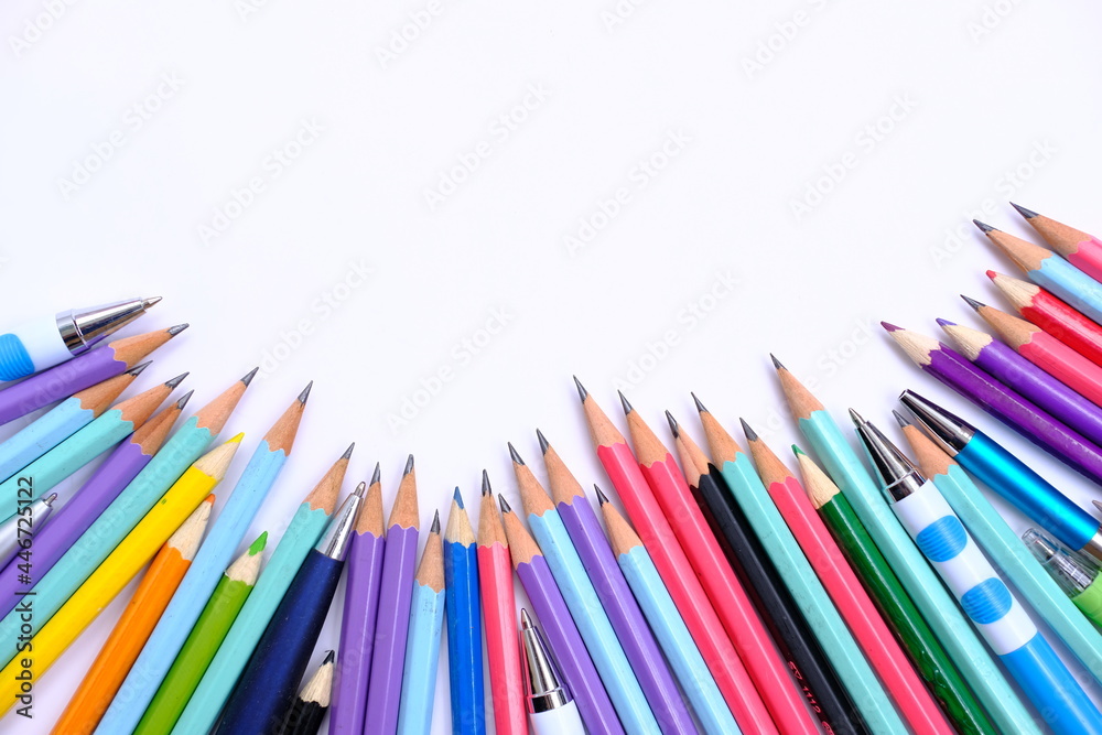Pen and pencil, office equipment on table background and Education concept, back to school