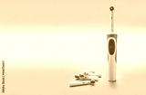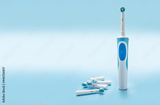 Modern electric toothbrush and spare heads on blue background. Modern sonic or electric toothbrush set with replacement heads.