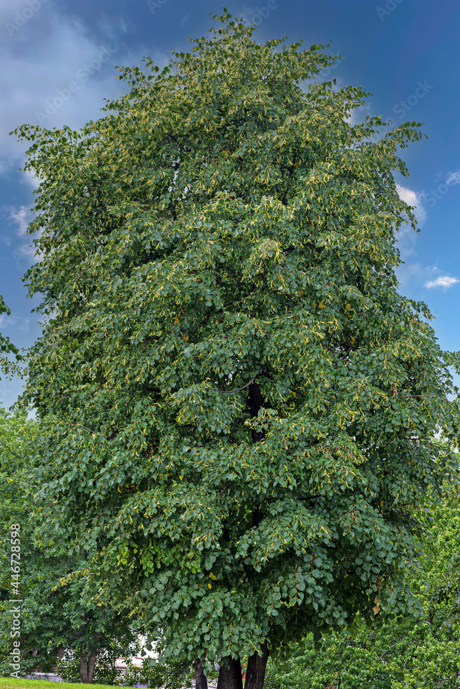 A blooming linden tree in a park alley on a summer day