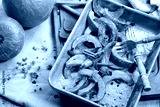 Kürbisspalten in einer Auflaufform mit Salbei und Zimt