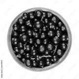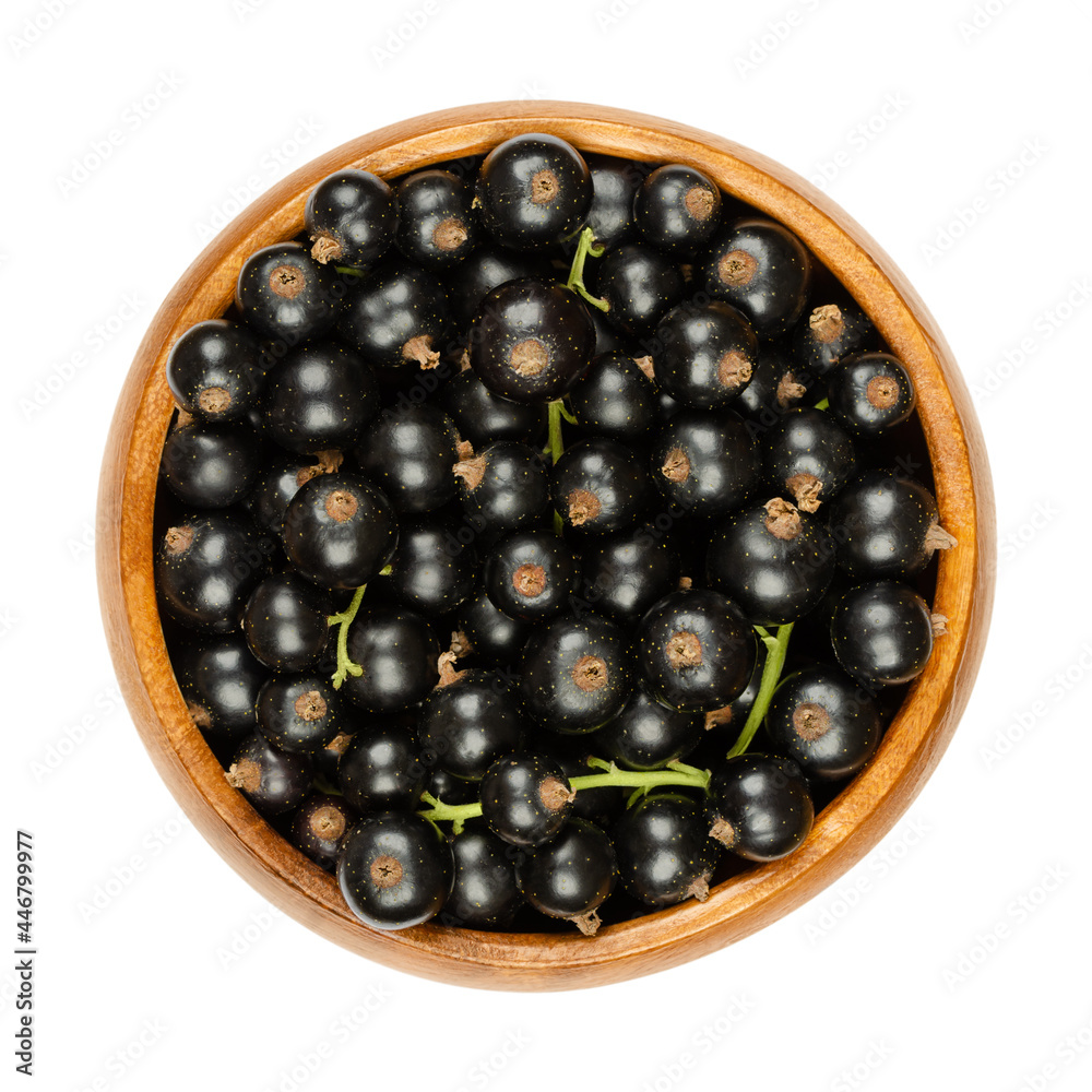 Blackcurrant berries, in a wooden bowl. Fresh, ripe black currant berries, also known as cassis, spherical edible fruits of Ribes nigrum. Sweet and small glossy fruits with strong, tart flavor. Photo.