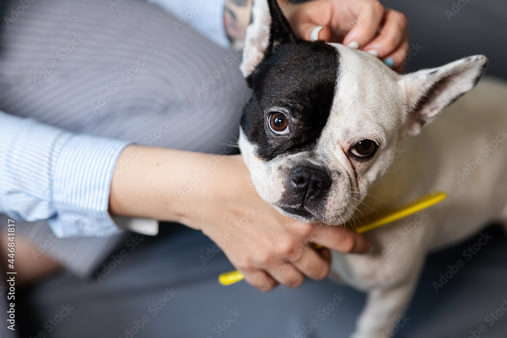 the owner of the dog combs a French bulldog on a gray background. the concept of pet care