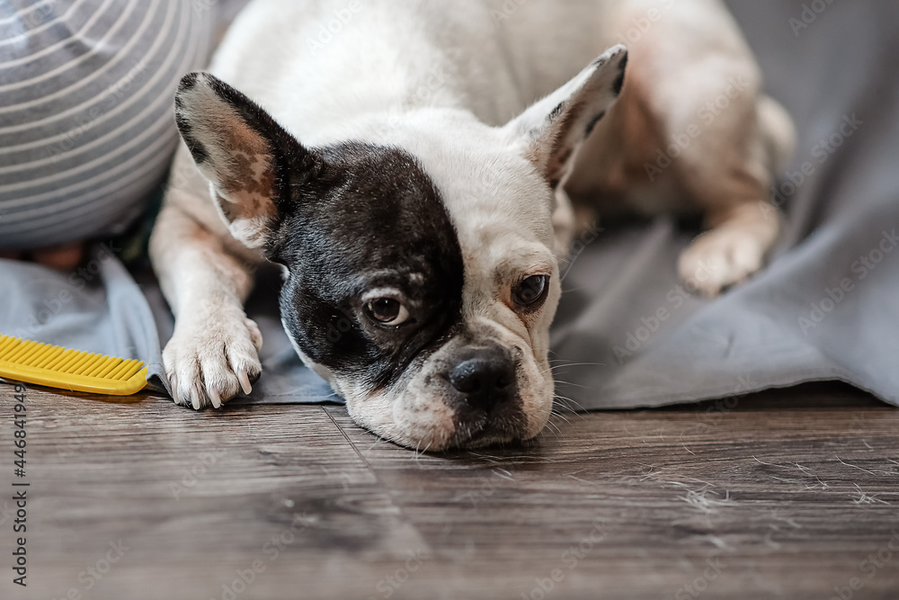 cute, two-tone French bulldog lies on the floor after the procedure of combing shedding hair, on a gray background