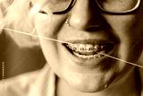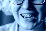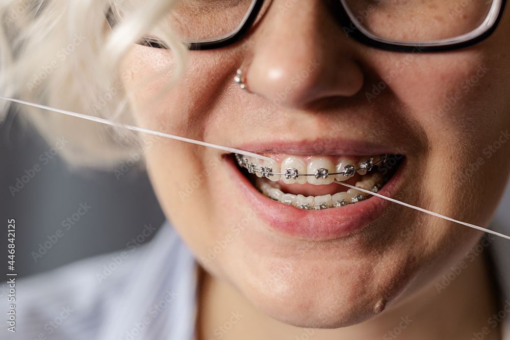 a young woman with braces flosses her teeth, close-up. The concept of oral hygiene and health care