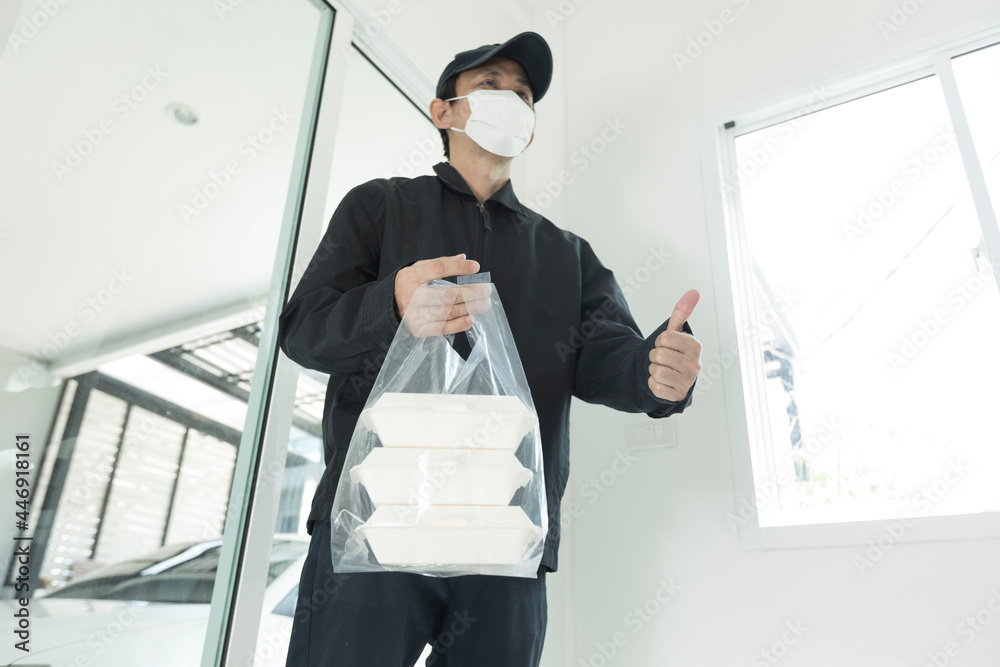 Man courier with protective mask deliver food. Food delivery courier in covid-19 pandemic. Covid-19 lockdown food delivery.