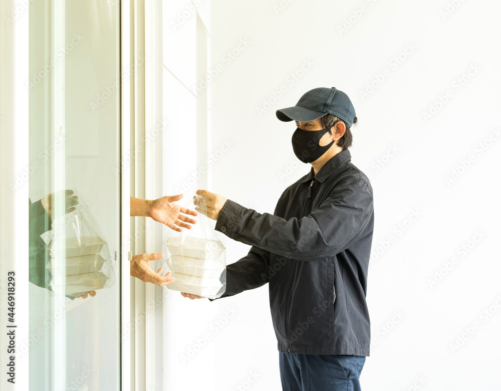 Man courier with protective mask deliver food. Food delivery courier in covid-19 pandemic. Covid-19 lockdown food delivery.