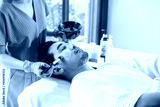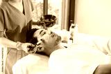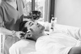 Asian men skin care. Beautician use clay mask on Asian man face. Young male relaxation in spa salon. Concept facial treatment and skin rejuvenation for men.