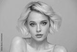 Portrait of a beautiful blonde girl with a short haircut. Gray background.