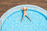 Young alone beautiful sports woman in bikini and hat is swimming in hydro massage bath on wooden terrace. Aerial drone view from above. Tropical summer luxury hotel