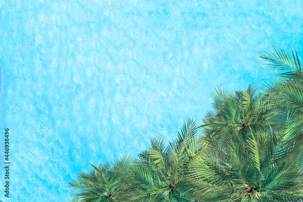 Aerial drone view from above on swimming pool and palm trees. Tropical summer luxury hotel