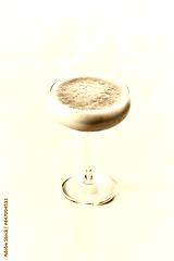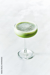 Smoothie and refreshing summer shake Iced Matcha Latte served in Champagne Saucer glass on white background