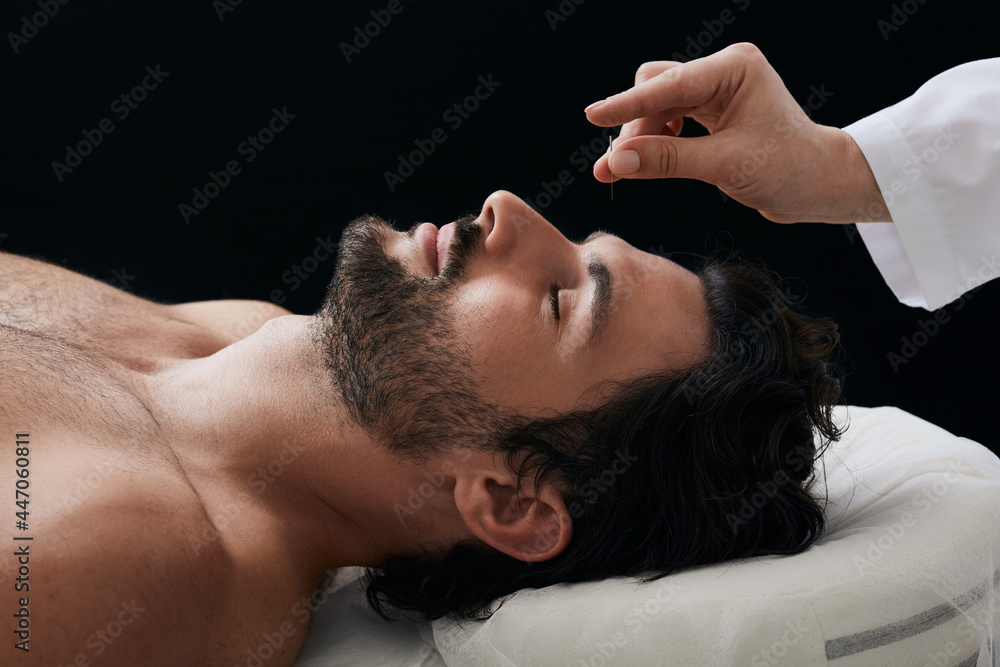 Acupuncturist inserts acupuncture needles into acupuncture point on male head for headaches. Traditional chinese medicine, reflexology