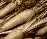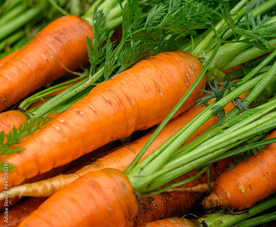 Crop of Fresh organic washed carrots with green tops