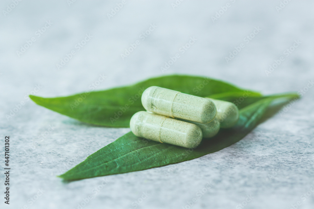 Andrographis capsule with green herbal leaf.