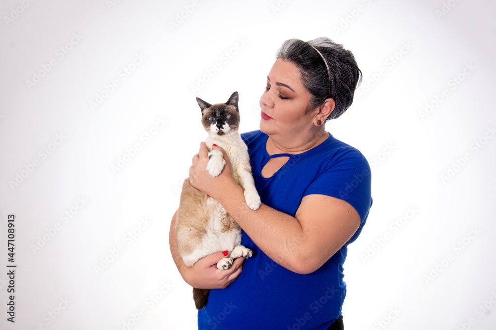 Diversity of people chubby young lady with white hair looking at the cat in her lap wearing blue on white background.