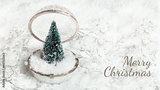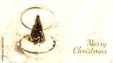 white vintage glass baubles and small Christmas tree in snow. Merry Christmas text and Happy New Year seasons greetings card. Crystal and golden elegant retro style decorations