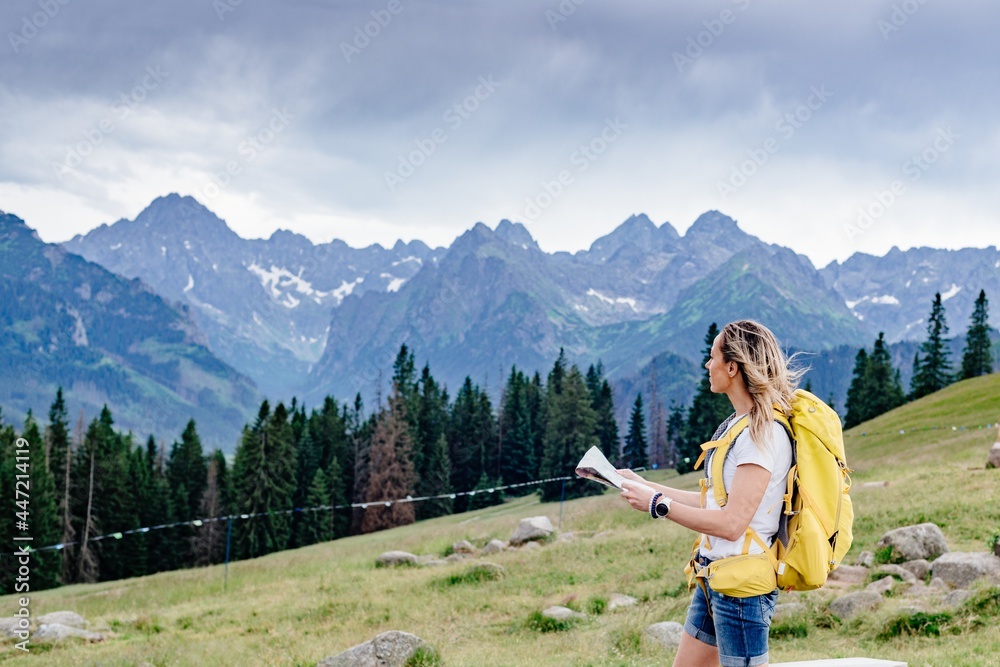 Adventurous girl navigating in with a topographic map in the beautiful mountains.