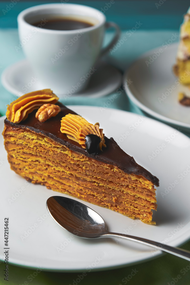 Piece of chocolate cake with icing on white plate. Served with a cup of black coffee.