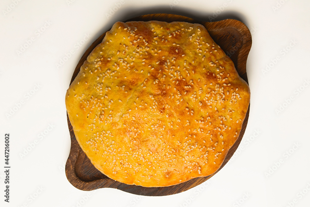 Khachapuri with cheese served on a wooden board isolated on white. Traditional Georgian cuisine concept.