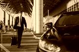 Full body young traveler businessman young man 20s wearing black dinner suit going walk outside at international airport terminal with suitcase to car booking taxi. Air flight business trip concept
