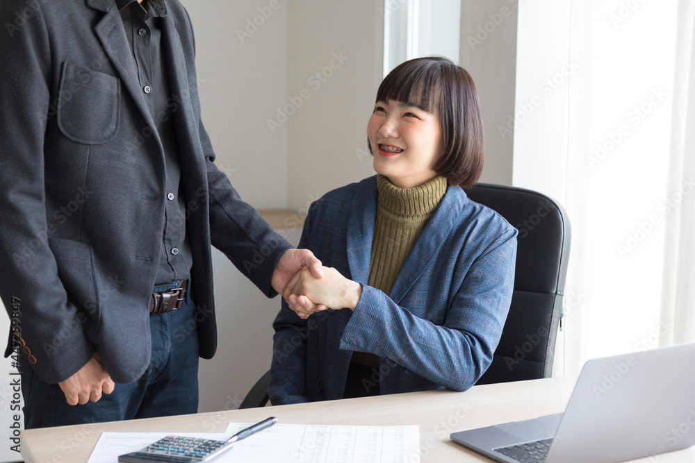 businesswoman and partners shake hands in the office.