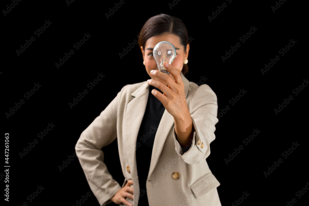 woman holding light bulbs, ideas of new ideas with innovative technology and creativity.