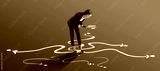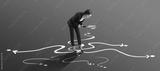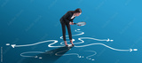 Choice and find your way concept with businesswoman looking through a magnifying glass on arrow roads drawn on bright blue surface.