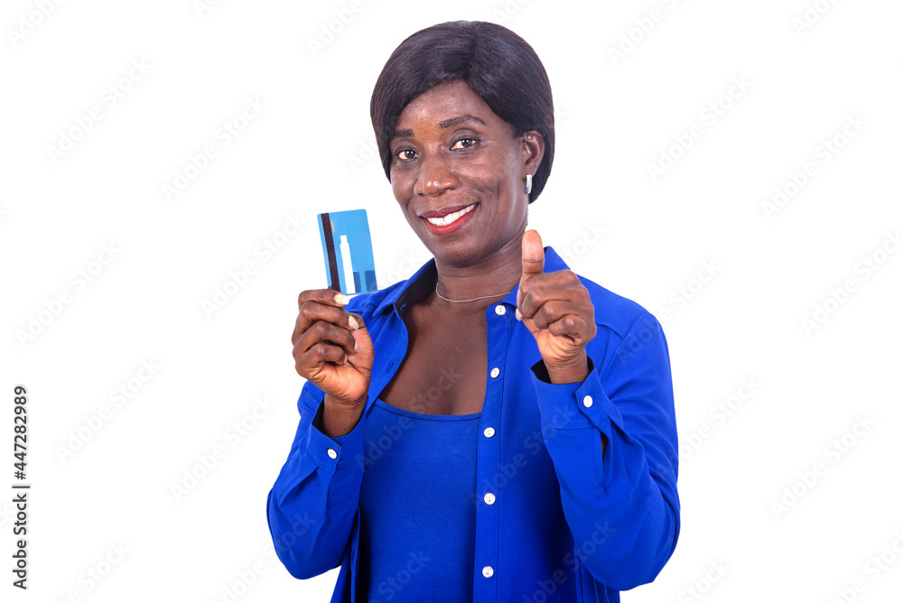 close-up of a beautiful businesswoman presenting a credit card, smiling.
