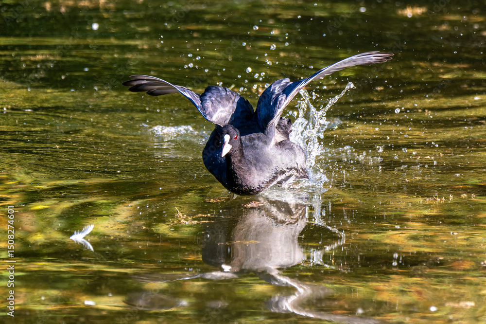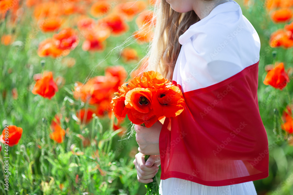 Close up of girl covered with flag of Poland holding bouquet of poppies in the poppy field. Polish Flag Day. Independence Day. Love Poland concept.