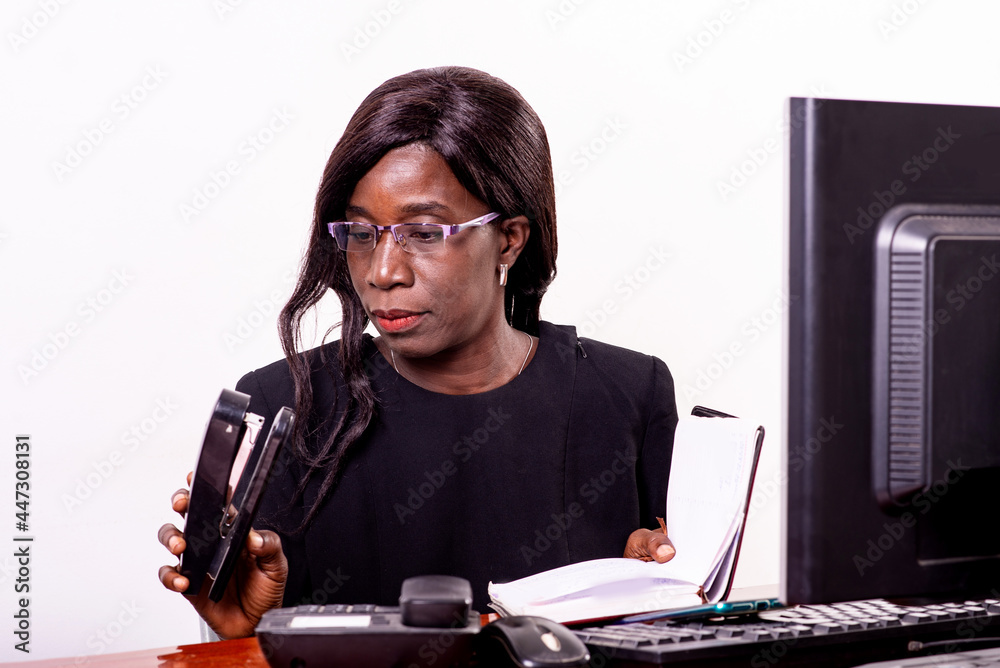 Serious mature businesswoman holding stapler in office.