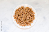Organic buckwheat Fusilli pasta in a white plate. Gluten Free Whole Grain Noodles. Healthy food concept. View from above. Flat lay